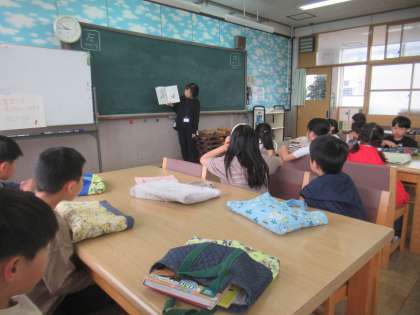 ヤシの木の下に置いたベッドで寝るへびの絵を見て子どもたちも思わずにっこり。