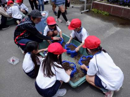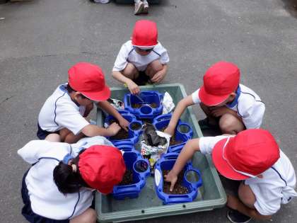 昨日種の観察をした1年生,今日は種まきをしました。手順がたくさんあって大変だったり,土を袋から植木鉢に入れるのが難しかったりしましたが,楽しく水やりまですることができました。