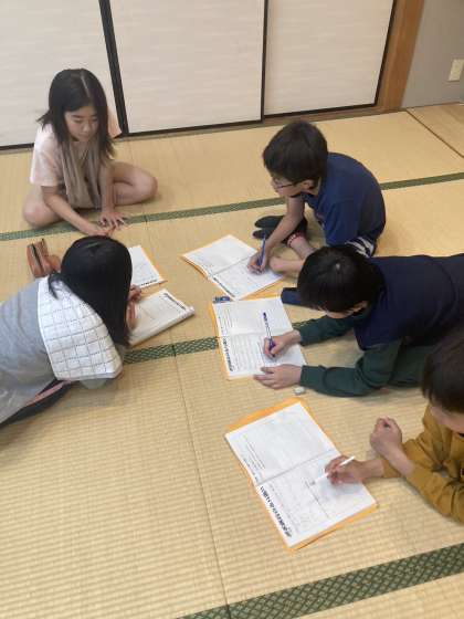 グループで一日の活動を振り返り、話し合っています。