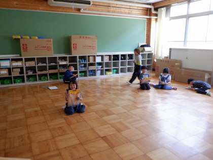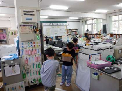 体育館,図書館,放送室,職員室,事務室など,それぞれの部屋でいろいろなものを見つけて帰ってきました。「シャワーがあった!」「おおたにせんしゅのグローブがあった!」などと教えてくれました。写真は,事務室,職員室,生活科室です。