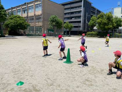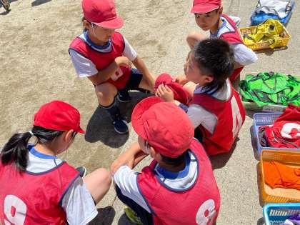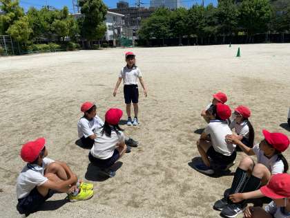 まずは、バトンの渡し方について教え、チームごとに練習しました。タイムをはかり、どうしたらタイムを縮めることができるか、分析しました。