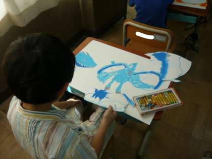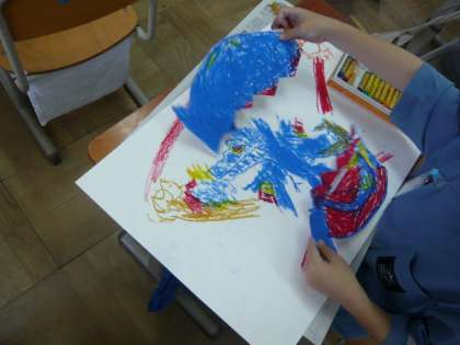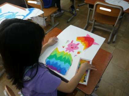 色の塗り方を工夫したり、卵から生まれてくるものをいろいろ考えていました。