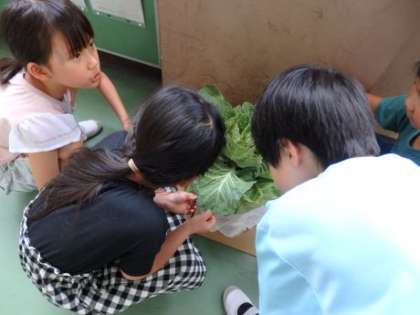 モンシロチョウのよう虫が大きくなってきたので、容器の中のそうじをしたり、キャベツの葉を新しくしました。これからも引き続き、お世話を頑張っていきます!