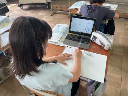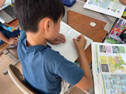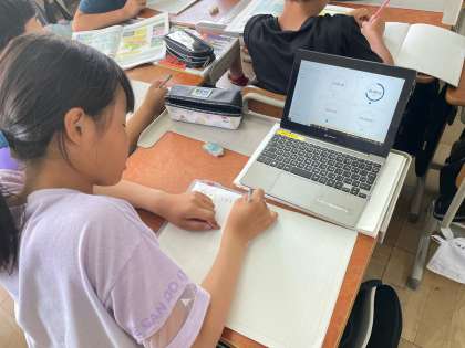琵琶湖の水がきれいになる仕組みを、資料から必要な情報を抜き出し、組み立てる作業を行いました。それぞれに合った方法を選択し、まとめやすい方法で時間管理をしながら頑張っています。