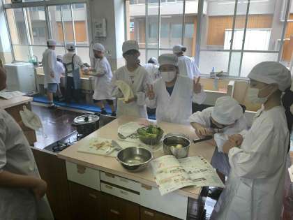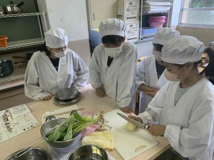 5年生が調理実習を楽しんでいます。