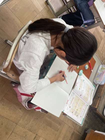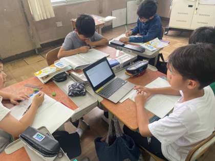 今回はあまりのあるわり算の筆算。今回は、子どもたちだけで学習を進めるスタイルで行いました。GIGA端末を使って、デジタル教科書の映像を見ながら進める子、友だちと一緒に進める子、一人でどんどん問題を解く子など、自分に合ったスタイルで進めています。