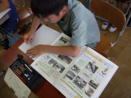今日は八坂神社の近くの様子を教科書で調べました。大きな道路があること、神社やお寺が多くて人も多いこと、お店屋さんもあることなどに気づきノートに書いていました。