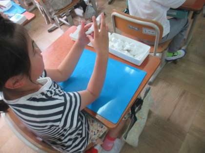 いろんな握り方を試しては、粘土を見て、何に見えるかを考えていました。