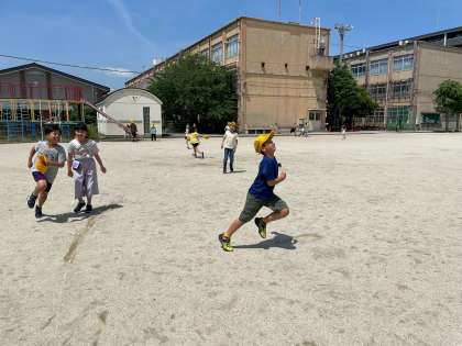 係活動で、みんな遊びをしました。みんなで遊ぶのは、久しぶりです。まずは、ふえおにをしました。やはり4年生、みんなタフです。2回戦は、「石木ばななこおり鬼」を教えて、やってみました。外で体を動かすのは、気持ちが良いですね。