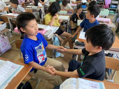 「楽しいマーチ」という曲のリズムに合わせて手拍子を打ちました。パートが二つあるので、なかなか苦戦している様子。お互いの音をよく聴きながら、練習をしました。