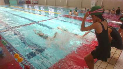 このグループは、背泳ぎ・クロールを25メートル泳ぐことができる子どもたちが集まっています。すいすい泳いでいます。最後に、平泳ぎの練習をしました。