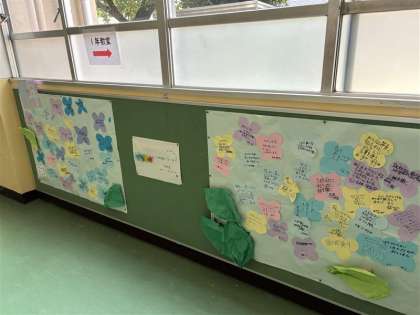 6月は5年生がふれあいコーナーの掲示担当ということで、人権にかかわる一人一人が大切にしたいことを書き、あじさいの花を作りました。自分も人も大切にしてほしいと思います。