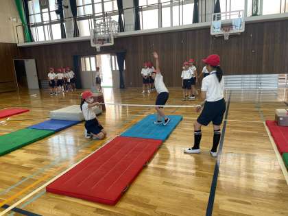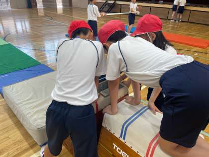 本格的なマット運動開始です。少し頑張ればできる技に挑戦することを目標に練習をしています。ゴムを使った場で側方倒立回転を行ったり、跳び箱を使って、首はね起きを練習したり、友だち同士で動画を確認しながら練習をしています。できる技にどんどん挑戦してほしいと思います。