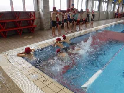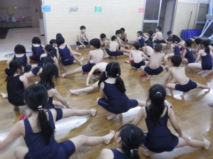 勉強係さんを中心に自分たちで準備運動をしました。みんな楽しそうです。そして、今日も頑張りました。クロールの手の動きも丁寧に指導していただきました。