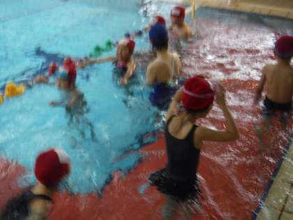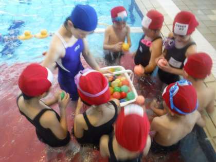 ボールを使いながら楽しく歩く練習。水の苦手な子もだんだん慣れてきて、笑顔が見られました。子どもたちの上達のはやさに驚かされます。