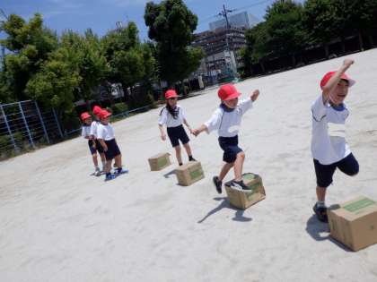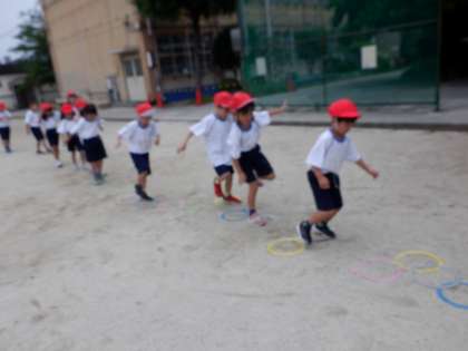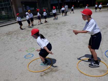今週からとびあそびをしています。リズムよく跳んだり,遠くに跳んだり,高く跳んだりできるように学習を進めていきます。箱を置いて高く跳ぶところは,マリオになって跳んでいました。