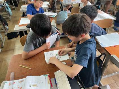 今日の算数の学習では、1組の三角定規を使って、垂直な直線、平行な直線を書く書き方の練習をしました。なぜ、こんな書き方をするのか、理由を聞いてみると、「直角」を使うことが大切なのではないか…という意見が出てきました。