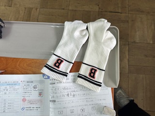 衣服の手入れについて学び、手洗いをした靴下としていない靴下を比べてみました。