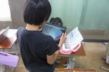 ぷっかりくじらをけんばんで弾いているところを