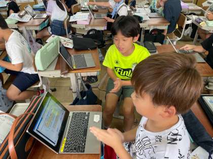 音楽では、「おまつり」という言葉を使って、様々なリズムを作る音楽づくりを行っています。GIGA端末を使いながら、リズムを組み合わせ、次の時間に、実際にペアでアンサンブルを発表してもらいます。様々な音楽を作ることができていました。