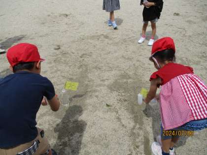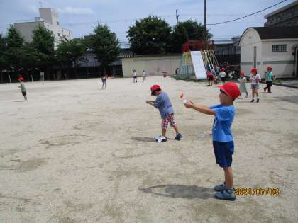 梅雨の合間の晴れ間に、水遊びをしました。地面に絵を描いたり水飛ばしを競い合ったりして、友達と楽しみました。来週も水遊びを楽しみます。