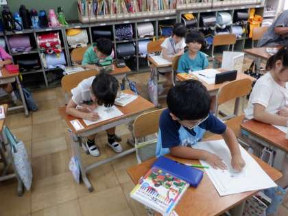 1年生になってから楽しかったことや思ったことを絵に表しました。今日は、絵日記も兼ねて、絵と文でかきました。