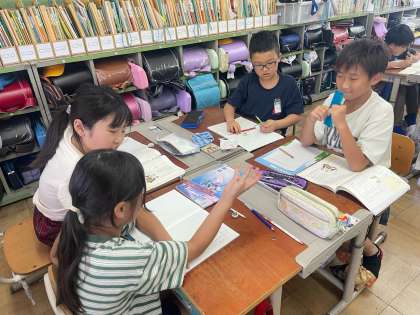 4年生は今、新聞を作る準備をしています。班ごとに、「誰に」「何を伝えるのか」について決め、役割分担を話合いました。どんな新聞ができるか楽しみです。
