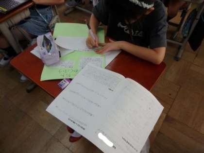 先日、社会見学で教えてもらったスーパーマーケットでの仕事のくふうをまとめています。それぞれがロイロノートでまとめたり、画用紙にまとめたりしています。