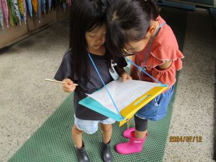 音楽の時間に、身の回りの音探しをしました。「ぴちゃぴちゃ」「かんかん」などいろいろな音を見つけて、満足そうに発表しました。