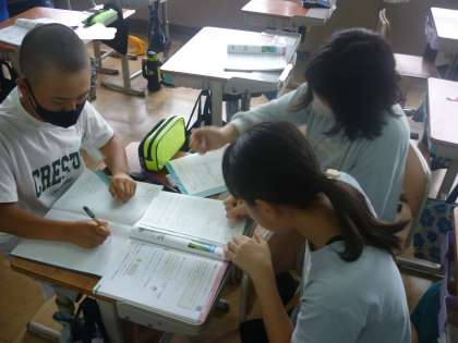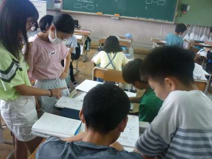 今日は、これまでの学習で学んできたことを活かして、どんな計算になるのかを考えました。今日の自由進度学習は、「いつもと違うメンバーで」、「男女が混ざり合って」と伝え、スタートしました。ねらいとしては、いつも同じメンバーでしているので、色々な人と話し合う経験をさせたかったためです。最終的には、「この問題は、あの人が得意だから一緒にやろう!」のように、問題の内容によって、だれとしていくのかを選択できるようになってほしいと思っています。1学期は、まずは自由進度学習に慣れることを目標にやってきました。2学期以降も、よりよい方法で一人ひとりが学んでいけるようサポートしていきたいと思います。