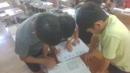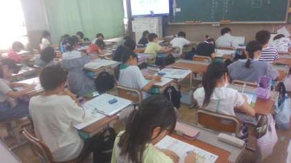 1学期最後の書写の学習です。漢字の書き順に目を向け、上から順に書く形と、左から順に書く形が漢字にあることを知ったうえで、上から書く漢字や左から書く漢字がどれぐらいあるのか、班で考えました。書いていくうちに、「部首」に目を向け、探す子たちも出てきました。最後は、字形に気を付け丁寧に書く練習をしました。自然と姿勢を正して練習をする子たちが増えてきたのが素敵です。