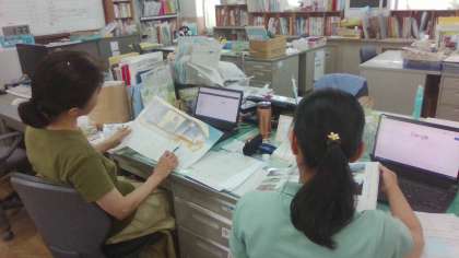 1年担任の先生は、2学期からも楽しく学習できるように資料を比べて授業の準備をしています。