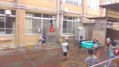おやじの会のスタッフの方から、遊び方や熱中症対策を聞いた後は、水鉄砲や水風船等の遊びを楽しみました。