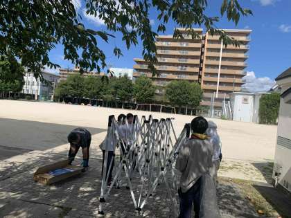 放課後に教職員で簡易テントを設営しています。
