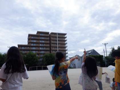 昨日から学習している「いちねんせいのうた」、声を合わせて上手に読むことができたので、今日は、本当の青い空に音読をしながら「一」を書いて楽しく読みました。