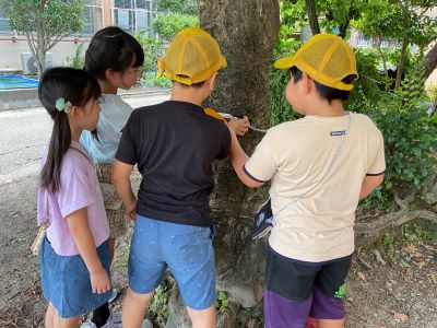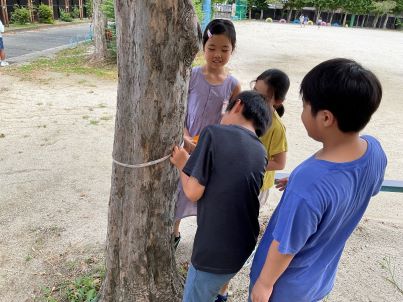 教室の縦と横の長さを測った後は、外に出て木の周りの長さを測りました。長いものやまるいものの長さを測るときには巻尺が便利なんだと気付きました。