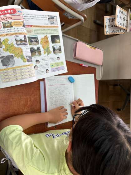 これまで学習した、調べたことをノートにまとめる方法を思い出しながら、京都府で起きた自然災害についてまとめました。友だちと一緒にまとめる子や、自分でがんばる子など、それぞれが集中して取り組んでいます。