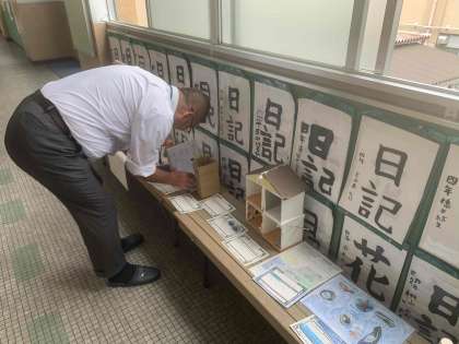 廊下にある子ども達の作品を見て、