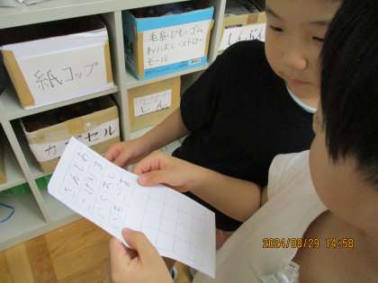 国語の時間に、言葉みつけをしました。教科書の問題から言葉を見つけた後、自分でも問題を作りました。友達に言葉を見つけてもらって、嬉しそうでした。