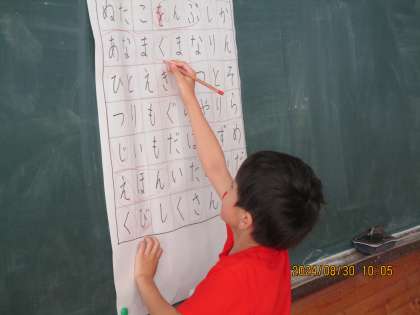 国語の時間に、黒板に貼った大きな紙の問題から、いろいろな言葉を見つけました。前に出て言葉を囲むのはドキドキしながらも楽しかったようです。