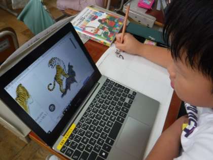 1組は「トラといっしょに」、2組は「アパートの人たち」という絵本の読み聞かせを聞き、物語の世界を想像してアイディアスケッチを描きました。素敵な作品になるといいですね。