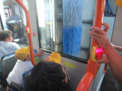 大きな機械についたブラシが回りながらバスを磨いていく様子を食い入るように見ていました。