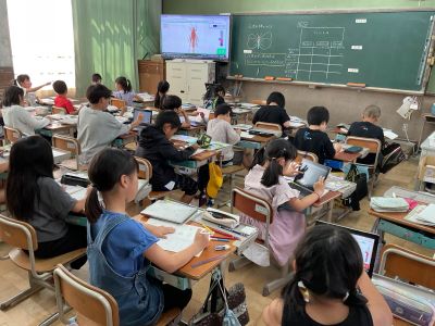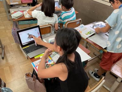タブレットを使って、こん虫のせい虫の体を調べました。どのこん虫も体は頭・むね・はらの3つの部分でできていることなどを確かめました。