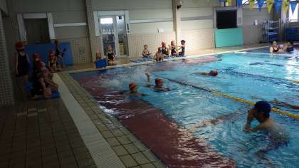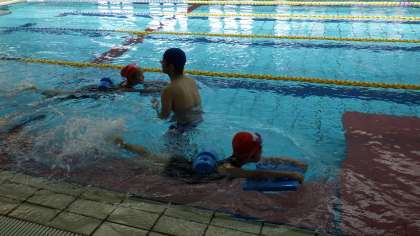 ビート板を使ってバタ足で10メートルほど進むことができるようになっています。