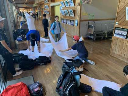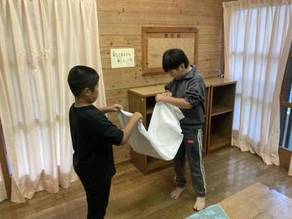 5年生花背山の家宿泊学習3日目「シーツたたみ」