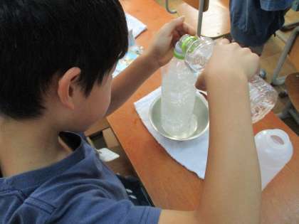 今日は、おうちから持ってきた入れ物を使って、かさくらべをしました。2つの入れ物でどちらが多く入るか調べたり、友達の入れ物と自分の入れ物を比べたりしました。ペットボトルやカップを持たせていただき、ありがとうございました。