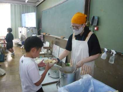 水あそびでたくさん泳いだ後、嬉しそうに、おいしそうにほおばっていました。