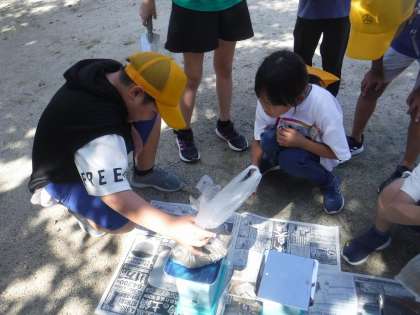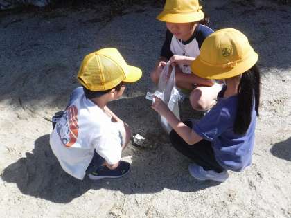 先日、いろいろな物をはかりで量った子どもたちです。1Kgはランドセルよりは少し軽くて、けんばんハーモニカよりは重い!!ということでだいたいの重さを予想して運動場へ。袋に1Kgだと思うまで砂を入れて量ってみました。実際に量ってみることで、1Kgって意外と軽いなぁと感じた子や、逆に意外と重いんやなぁと感じた子もいました。