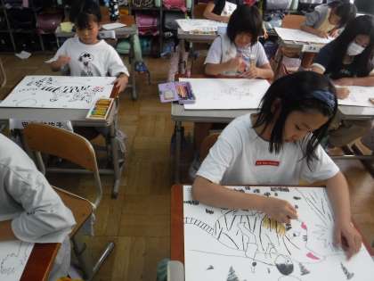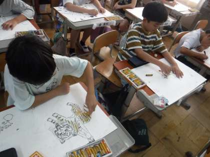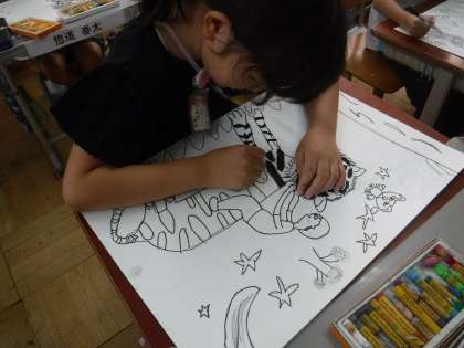 下絵が終わり、いよいよクレパスや絵の具を使って色を塗り始めました。色を塗ると、絵の雰囲気ががらりと変わり、どれも子どもらしい作品で素敵です。また次の参観の時にご覧いただけたらと思います。