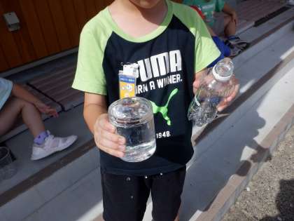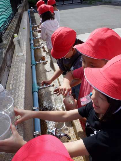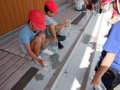 今日は「かさくらべ」をしました。もう一つの容器に入れ替えて比べたり、同じ入れ物に移しかえて比べたりする方法で、友だちの容器とかさを比べました。